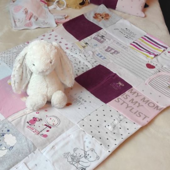 Chaque couverture est confectionnée à partir des vêtements de votre enfant : bodies, pyjamas, petites tenues… soigneusement assemblés pour créer une pièce unique, pleine de douceur et d’émotion.