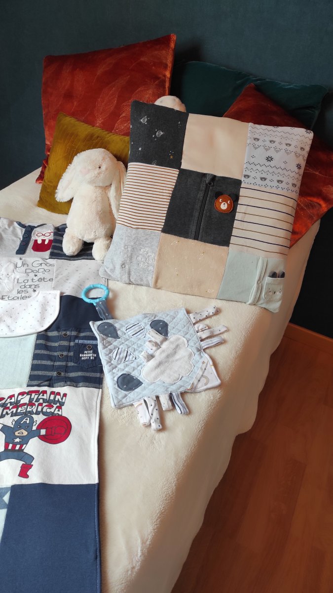 Chaque couverture est confectionnée à partir des vêtements de votre enfant : bodies, pyjamas, petites tenues… soigneusement assemblés pour créer une pièce unique, pleine de douceur et d’émotion.